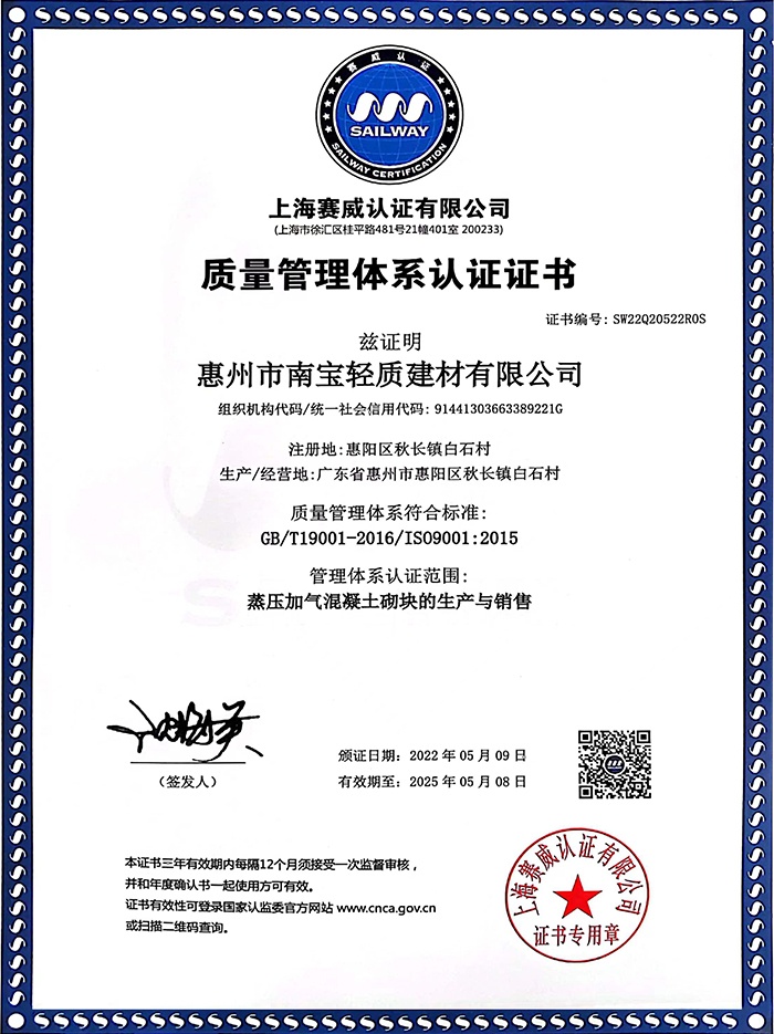 廣東省惠州市南寶輕質建材有限公司成立于2007年,公司一直致力于新型環(huán)保的墻體材料的開發(fā)、生產和銷售服務,生產的蒸壓加氣混凝土砌塊遍布惠州、深圳及周邊城市,以高品質、高性價比的產品和優(yōu)良的服務質量榮獲良好的行業(yè)口碑,公司于2020年再接再勵,投入3000余萬資金引進行業(yè)領先的6米全自動加氣混凝土砌塊生產線,具備年產量40萬方加氣混凝土砌塊的產能,同時使產品品質、性能更加優(yōu)越。